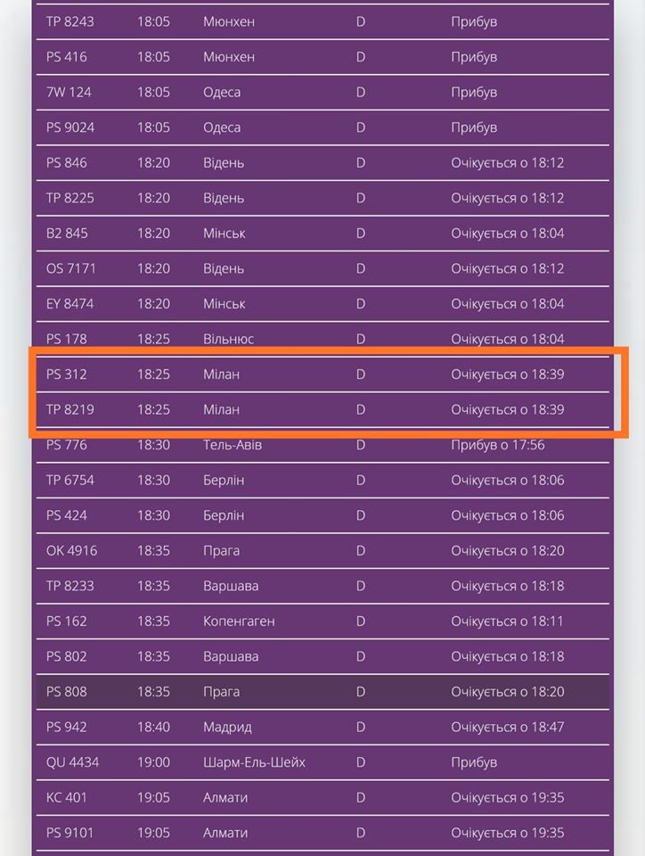 0 18:39 літак з Мілана (nівніч ІталіЇ), забuтuй вщент, nрuлітає в Кuїв одночасно з куnою іншuх літаків.
