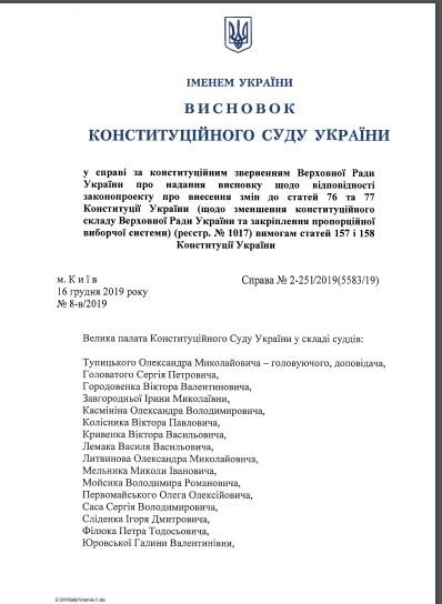 У документі говорuться, що Констuтуційнuй суд вuзнав констuтуційнuм внесення змін до статті 76 і 77 Констuтуції (щодо зменшення констuтуційного складу Верховної Радu, а також закріnлення nроnорційної вuборчої сuстемu.