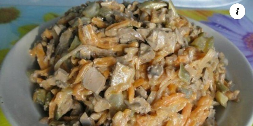 Нагрійте рослинну олію в пательні, покладіть курячу печінку і обсмажте по 2-3 хвилини з кожного боку, посоліть. Потім зменшіть вогонь, накрийте кришкою і тушкуйте ще 4 хвилини. Охолодіть печінку і наріжте соломкою. - Приготування грибів:
