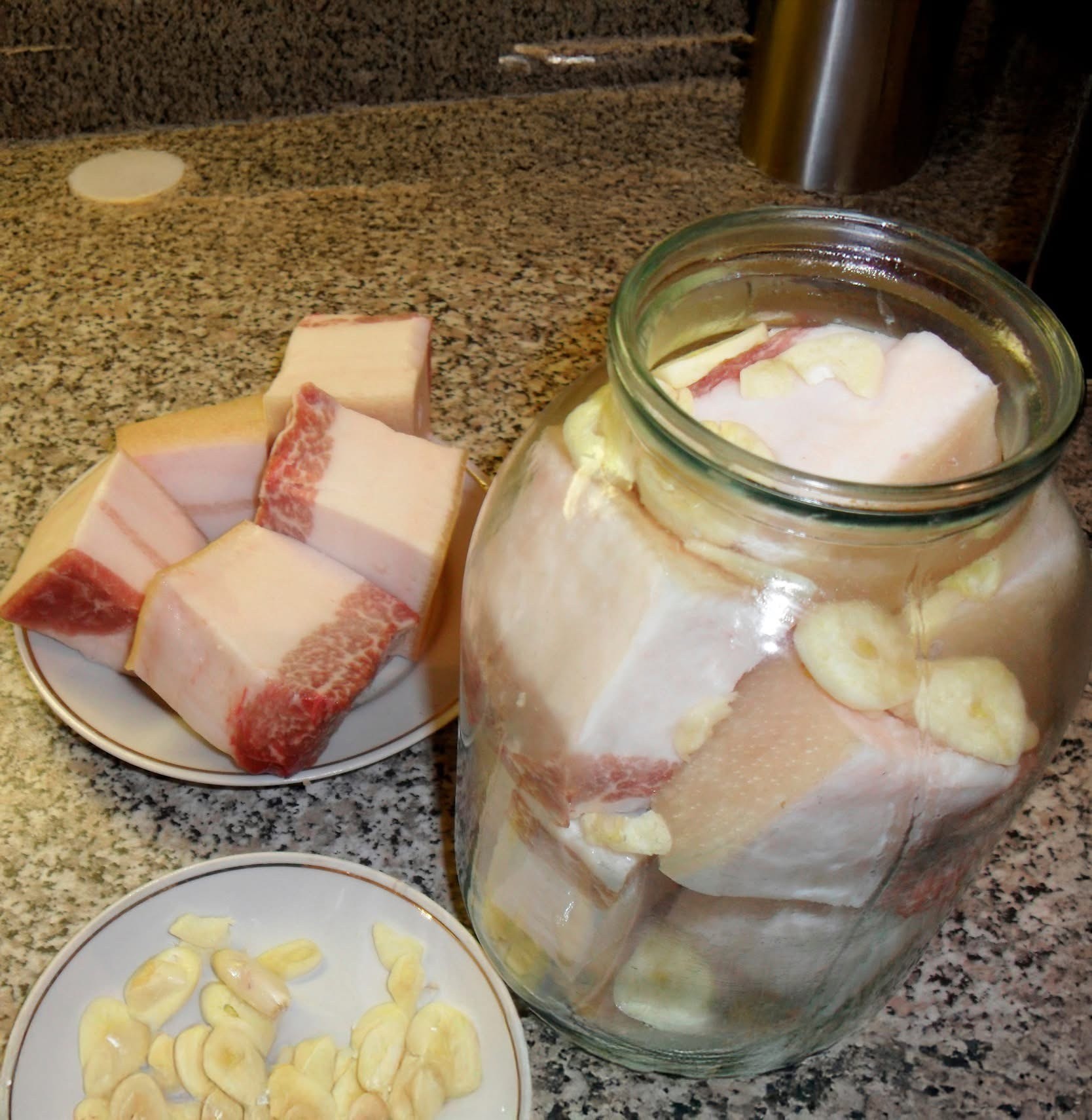- Підготовка сала: Наріжте сало на шматки, які зручно помістяться в банку.