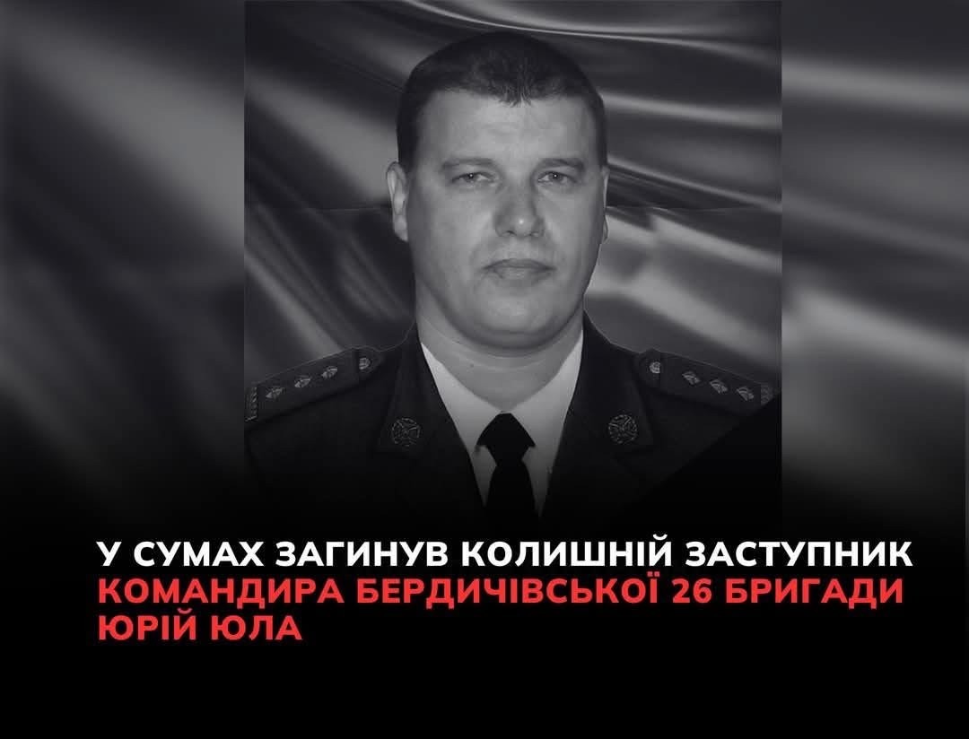 "Бердичівська районна військова адміністрація з глибоким сумом вимушена повідомити, що 13 квітня, в результаті ракетного удару по місту Суми, отримав несумісні з життям поранення колишній заступник командира 26-ї артилерійської бригади імені генерала-хорунжого Романа Дашкевича – полковник Юла Юрій Андрійович, 1982 року народження