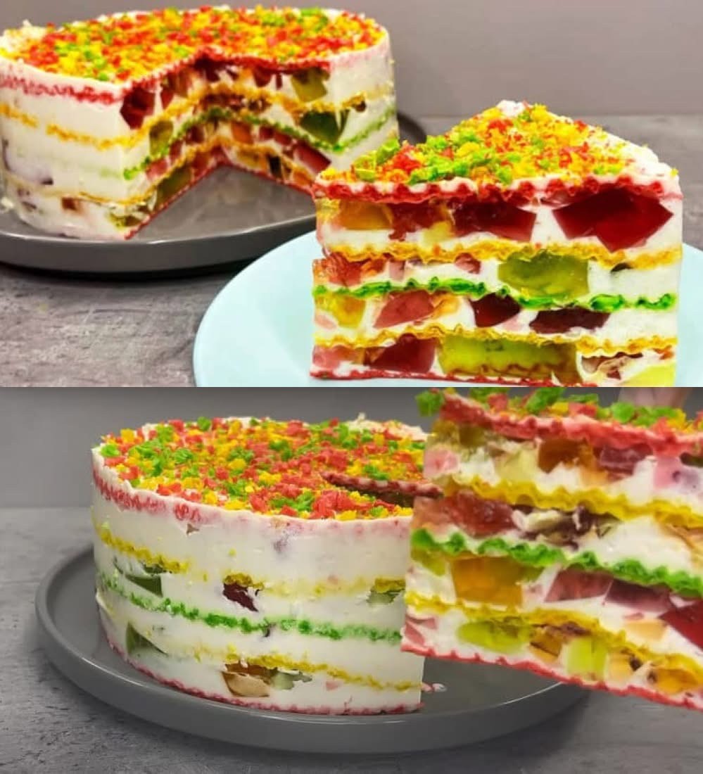 Кладу кубики желе, змащую кремом, тоді знову вафлі і так складаю весь торт.