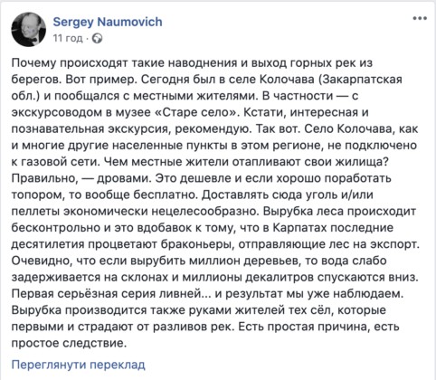 Почему происходят такие наводнения и выход горных рек из берегов. Вот пример. Сегодня был в селе Колочава (Закарпатская обл.) и пообщался с местными жителями. В частности — с экскурсоводом в музее «Старе село».