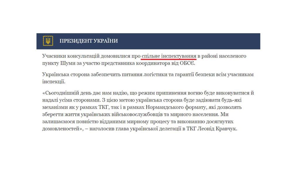 “Учасники консультацій домовилися про спільне інспектування в районі населеного пункту Шуми за участю представника координатора вiд ОБСЄ. Українська сторона забезпечить питання логістики та гарантії безпеки всім учасникам інспекції”.