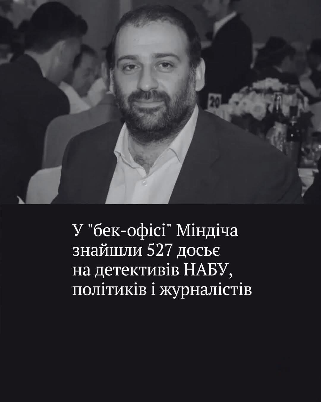 Детектив НАБУ Олександр Абакумов повідомив, що у "бек-офісі" Міндіча виявили масив із 527 довідок із закритими персональними даними про детективів НАБУ, депутатів, чиновників, журналістів та силовиків.