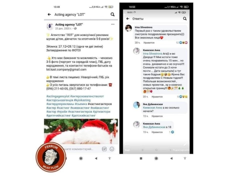 Як сказано у повідомленні, для зацікавлених батьків "Лот" в особистих повідомлення уточнював, що "зніматиметься новорічне привітання президента Зеленського. Діткам потрібно буде відігравати емоції".