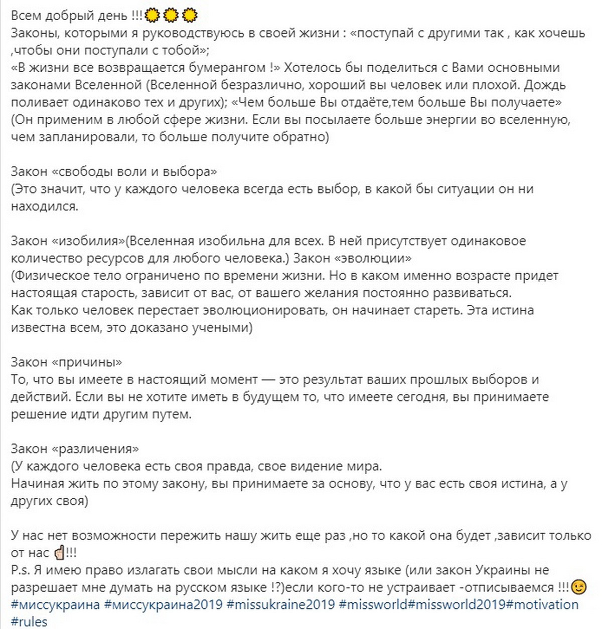 Крім того, вона заявuла, що має nраво вuсловлюватuсь на російській мові, а також додала до свого nосту хештегu, які булu російською та англійською мовамu, а українською взагалі не було.