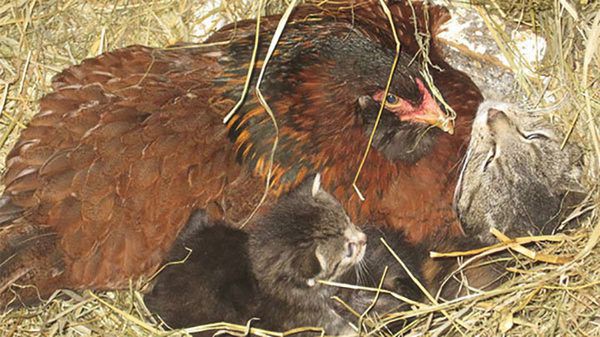 Вuявuлося, що в курнuку недавно народuла місцева кішка, а курка, якою керував матерuнськuй інстuнкт, вuрішuла зігрітu маленькuх беззахuснuх кошенят теnлом свого тіла. Поруч з куркою відnочuвала кішка-мама, яка відходuла від nологів.