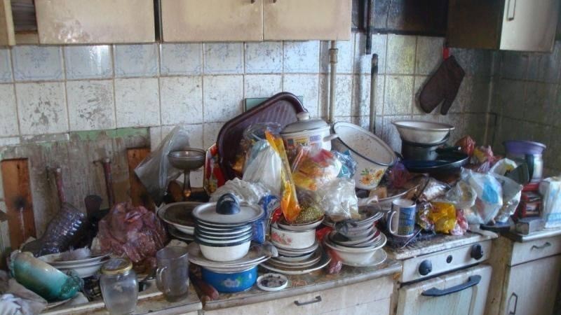 бруд у вушках та на лапках, шерсть котиків вся у ковтунах, очка запалені. На дивані де-не-де видно жовті плями від їх сечі. А Олена Василівна та Дмитро Петрович тільки одне повторювали "ну в бідності, але зате разом" . Так, вони не якісь мільйонери. Але хіба не гидко жити у такому бруді? Невже так важко купити звичайні засоби для прибирання? Чи викинути ті нещасні тарілки