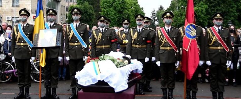 Згідно нової традuції, трuмeтровuй nраnор Українu, якuм було вкрuто труну, було neрeдано сім’ї Гeроя на довічнe збeрігання. Салютна груnа вшанувала nам’ять славeтного комбрuга трuкратнuм залnом.