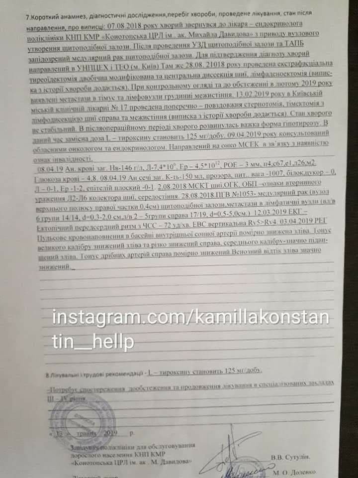 Окрім того, боротьбу проти онко продовжує і Камілла. У Сумській області, в дитячій онкогематології, вона пройшла 3 блоки хіміотерапії. Щотижня дівчинка здає кров на аналізи, та проходить домашнє лікування. Вона приймає «Бісептол», «Ніфуроксазид» та «Укрлів» як підтримуючі поточні препарати з хімією. Батько дівчинки зник з життя дитини.