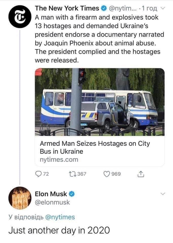 Ілон Макс прокоментував вчорашнє захоплення автобуса з пасажирами в центрі Луцька. Мільярдер і винахідник, що завжди активний у соцмережах, відповів жартом на події в Україні 21 липня, які облетіли весь світ.