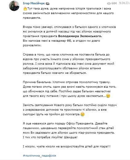 Вчора пізно увечері, спілкувався з батьком одного з хлопчиків які знімалися в дитячій масовці під час зйомок новорічного привітання президента Володимира Зеленського.