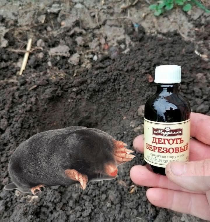 Візьміть декілька дерев’яних кілків по 20 см завдовжки та 3 см завширшки. Всі кінці змастіть дьогтем та встроміть по периметру ділянки. Також, можна встромити кілки в свіжі насипи, що залишилися після кротів. За декілька днів на ділянці не залишиться жодного крота. Дьоготь не шкодить цим істотам, а лише відлякує їх.