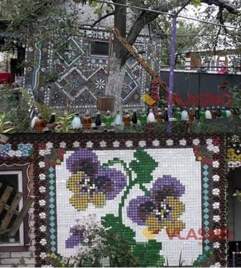 Всі стіни хати Миколи Демкова “вишиті” квітами з кришечок від пластикових пляшок, різнокольорових камінчиків, шматочків скла та інших матеріалів.