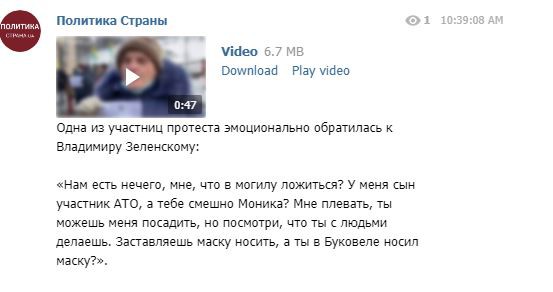 «НАМ ЇСТИ НІЧОГО, МЕНІ, ЩО В МОГИЛУ ЛЯГАТИ? У МЕНЕ СИН УЧАСНИК АТО, А ТОБІ СМІШНО МОНІКА? МЕНІ ПЛЮВАТИ, ТИ МОЖЕШ МЕНЕ ПОСАДИТИ, АЛЕ ПОДИВИСЯ, ЩО ТИ З ЛЮДЬМИ РОБИШ. ЗМУШУЄШ МАСКУ НОСИТИ, А ТИ В БУКОВЕЛІ НОСИВ МАСКУ? ».