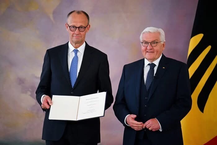 Спочатку Мерц попрямував до Великої зали палацу Бельвю – резиденції президента Німеччини. Там президент Франк-Вальтер Штайнмаєр вручив Мерцу свідоцтво про призначення канцлером.