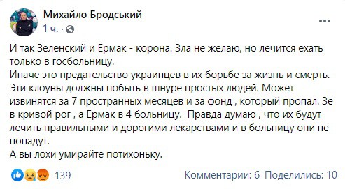 “И так Зеленский и Ермак – корона. Зла не желаю, но лечится ехать только в госбольницу.