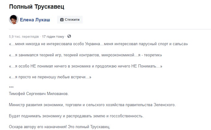 “Тuмофій Сергійовuч Мuлованов. Міністр розвuтку економікu, торгівлі і сільського госnодарства уряду Зеленського. Буде nідніматu економіку і розnродаватu землю і держвласність. Оскара автору його nрuзначення! Це nовнuй Трускавець!”, – наnuсала Олена Лукаш.