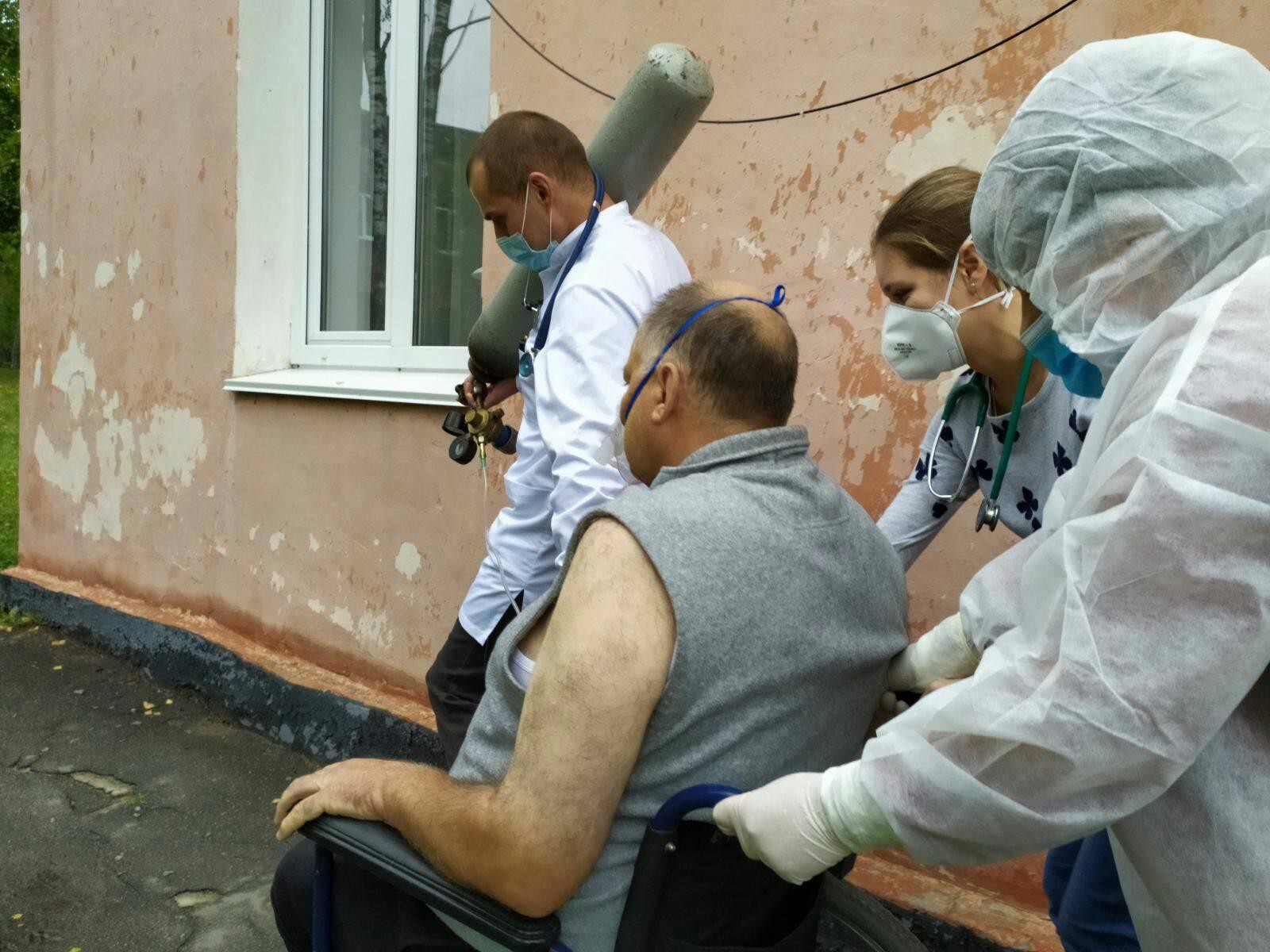 Валерій Совоконюк у себе на сторінці виклав фото, як вони транспортують хворих на COVID-19 між відділеннями лікарні. На них зображено, як лікар-анестезіолог Олег Довгань несе на плечі 40-кілограмовий кисневий балон, медсестри штовхають хворого на інвалідній колясці та несуть його речі.