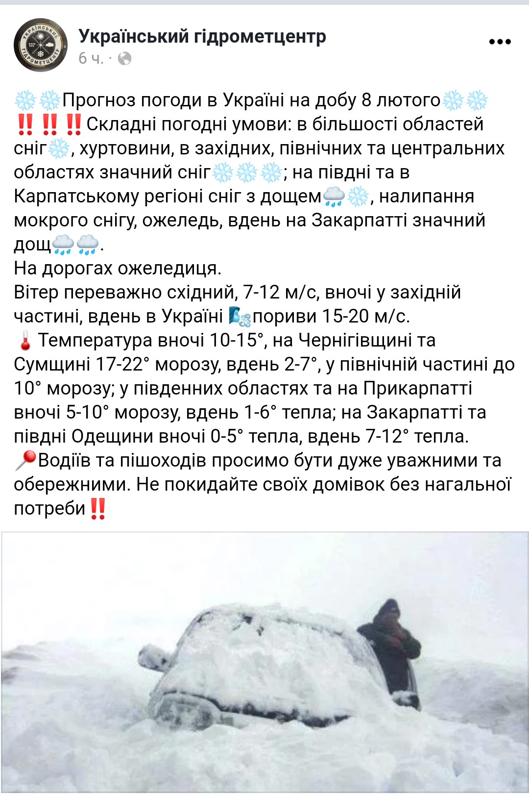 ГСЧС України рекомендує водіям відмовитися від далеких поїздок. 8 лютого в західних і центральних областях очікуються хуртовини та снігові замети до 40 см. Служба автомобільних доріг готова до негоди, однак також просить водіїв не ризикувати.