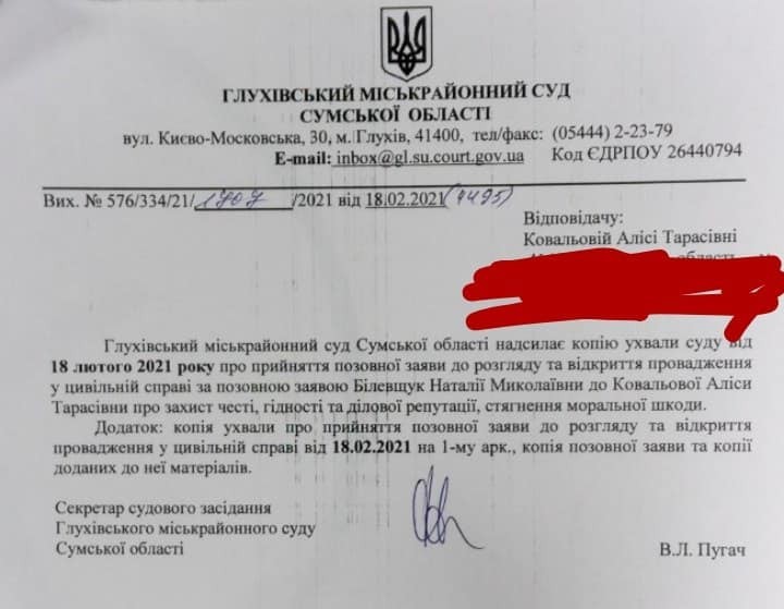 Сама пані Аліса написала про це в неділю на ФБ – в четвер, 18 лютого, Глухівський міськрайонний суд Сумщини прийняв ухвалу про відкриття провадження у цивільній справі за позовом “сильнопотерпілої вчительки”. І пані Аліса досі не має адвоката, котрий би захистив інтереси її і її дитини в цій неймовірній за цинізмом справі.