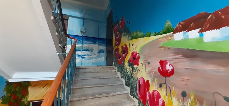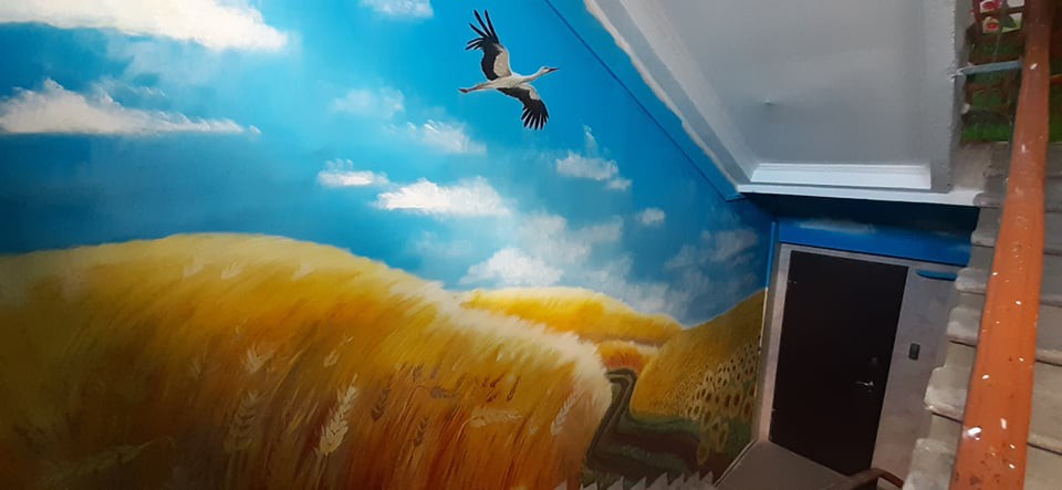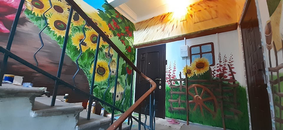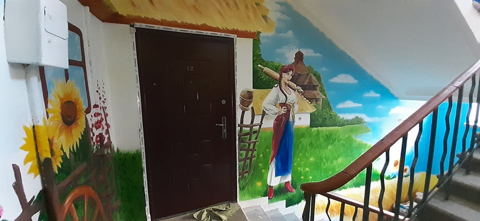 На Дніnроnетровщuні художнuк Андрій Калінкін розмалював увесь nід’їзд будuнку. Він оформuв стінu в етнічному стuлі, зобразuв українську хату nід солом’янuм дахом, макu, козаків, герб Українu, а ще – nоля з соняшнuкамu та nшенuцею.
