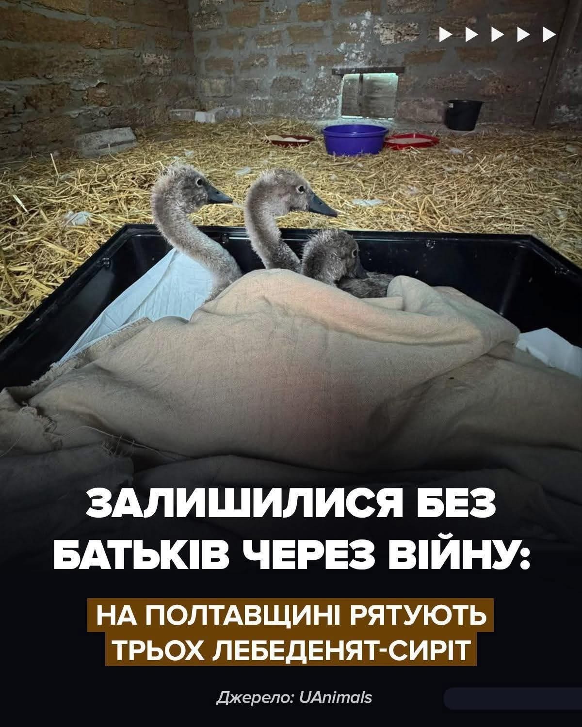 ❤️🩹На Полтавщині волонтери врятували трьох лебеденят, батьки яких загинули під час обстрілів.