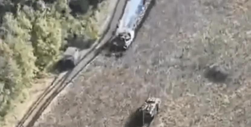 Проте бронетранспортер отримав пряме попадання снарядом вагою близько 30 кілограмів. Дивно, але кілька російських солдатів змогли вибратися з пошкодженого БТР. Один із них пробіг повз український танк, а його екіпаж не відкрив вогонь із кулемета, що викликало подив у спостерігачівДвоє інших російських солдатів сховалися за розбитим БТР, але вибух поруч (можливо, спричинений дроном або гранатою) змусив їх кинутися у втечу. Саме в цей момент другий український танк випустив ще один снаряд, завдавши додаткової шкоди вже знищеному бронетранспортеру.