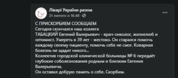 Судячи з повідомлення, причиною його смерті став коронавірус.”Помер наш колега Табацький Євген Валерійович – лікар-онколог, життєлюб і оптиміст. Померти в 39 років – жорстоко. Він намагався допомогти кожному своєму пацієнту, допомогти собі не зміг. Підступна хвороба не щадить нікого… Колектив міської клінічної лікарні № 6 передає глибокі співчуття рідним і близьким Євгена Валерійовича. Він залишив добру пам’ять про себе. Сумуємо”, – йдеться в повідомленні.
