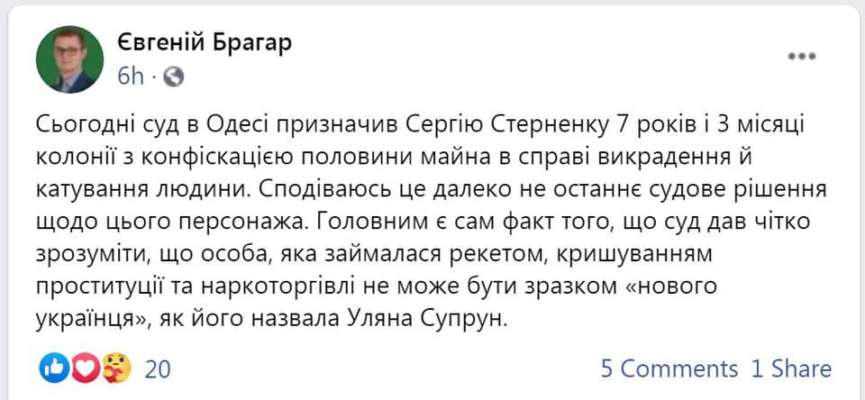 Сергія Стерненка Одеський суд сьогодні засудив до 7-х років і 3-х місяців колонії з конфіскацією. Прокремлівський пул і сміття на кшталт “Продай пса”-Брагара тішиться.