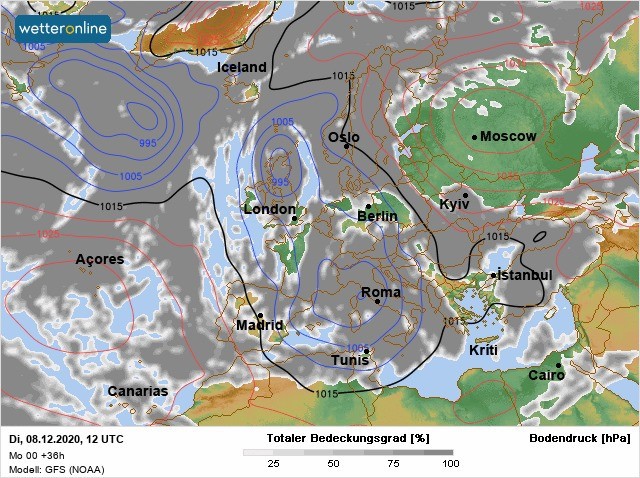 У Києві 8-го грудня сонця поменшає, хмар та вологості повітря побільшає (карта), вдень можлива навіть якась сніжна невеличка мряка, але нічого серйозного.