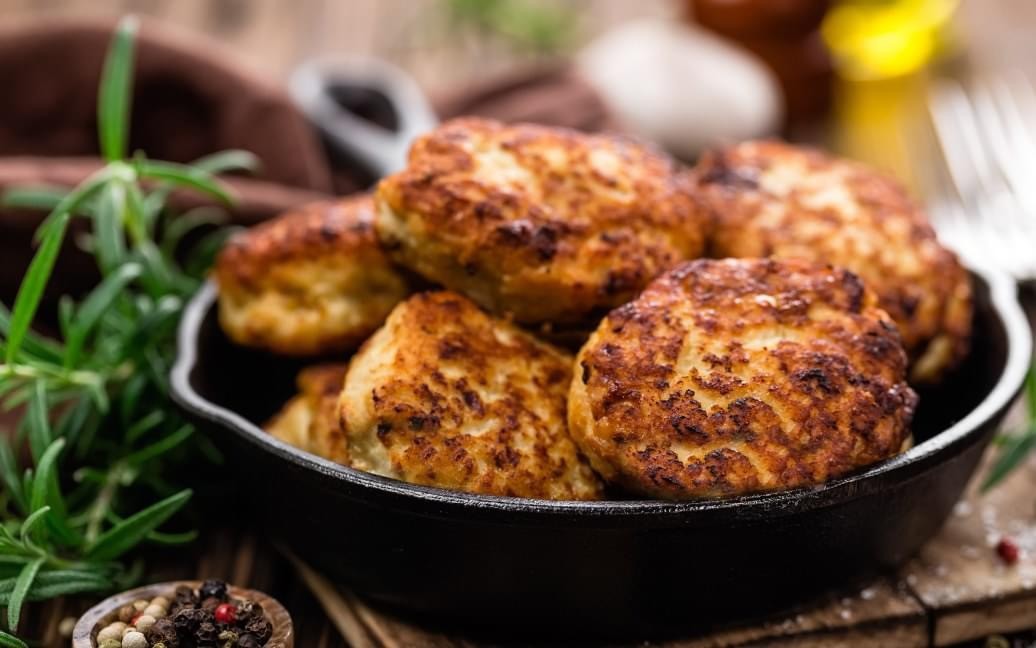 Змастіть руки олією чи водою та сформуйте котлети. Обсмажуйте котлети на сковорідці по 5 хвилин з обох боків до золотавої скоринки. Опісля складіть їх на пательню, накрийте кришкою та протушкуйте дві хвилини, щоб вони стали більш соковитими та ніжними
