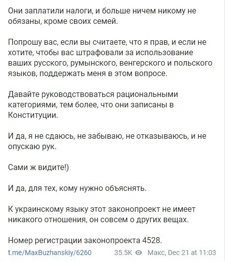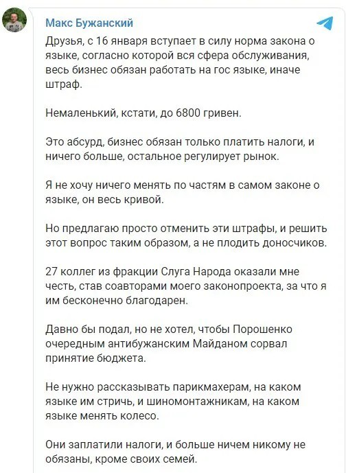 “Друзі, із 16 січня набирає чинності норма закону про мову, згідно з якою вся сфера обслуговування, увесь бізнес повинен працювати державною мовою, інакше – штраф. Немаленький, до речі, до 6800 гривень. Це абсурд, бізнес зобов’язаний лише платити податки й нічого більше, інше регулює ринок”, – написав Бужанський.