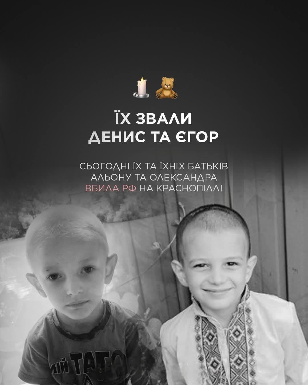 Загинули маленькі братики Денис (4 роки) та Єгор (6 років), їхні батьки — Альона та Олександр Лєсніченко. Місцеві медіа повідомляють, що Альона була вагітна…