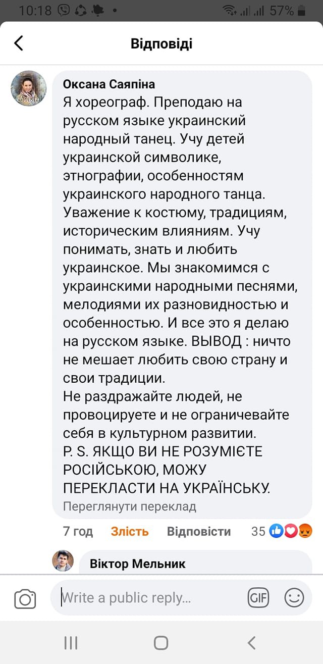 Обухівчанка Оксана Саяпіна, яка працює хореографом, коментуючи допис відзначила, що викладає дітям російською