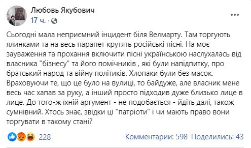 Обухівчанка Любовь Якубович у місцевій групі Мій Обухів / Обухівський район опублікувала допис в якому описала неприємний інцидент, який з нею трапився біля Велмарту