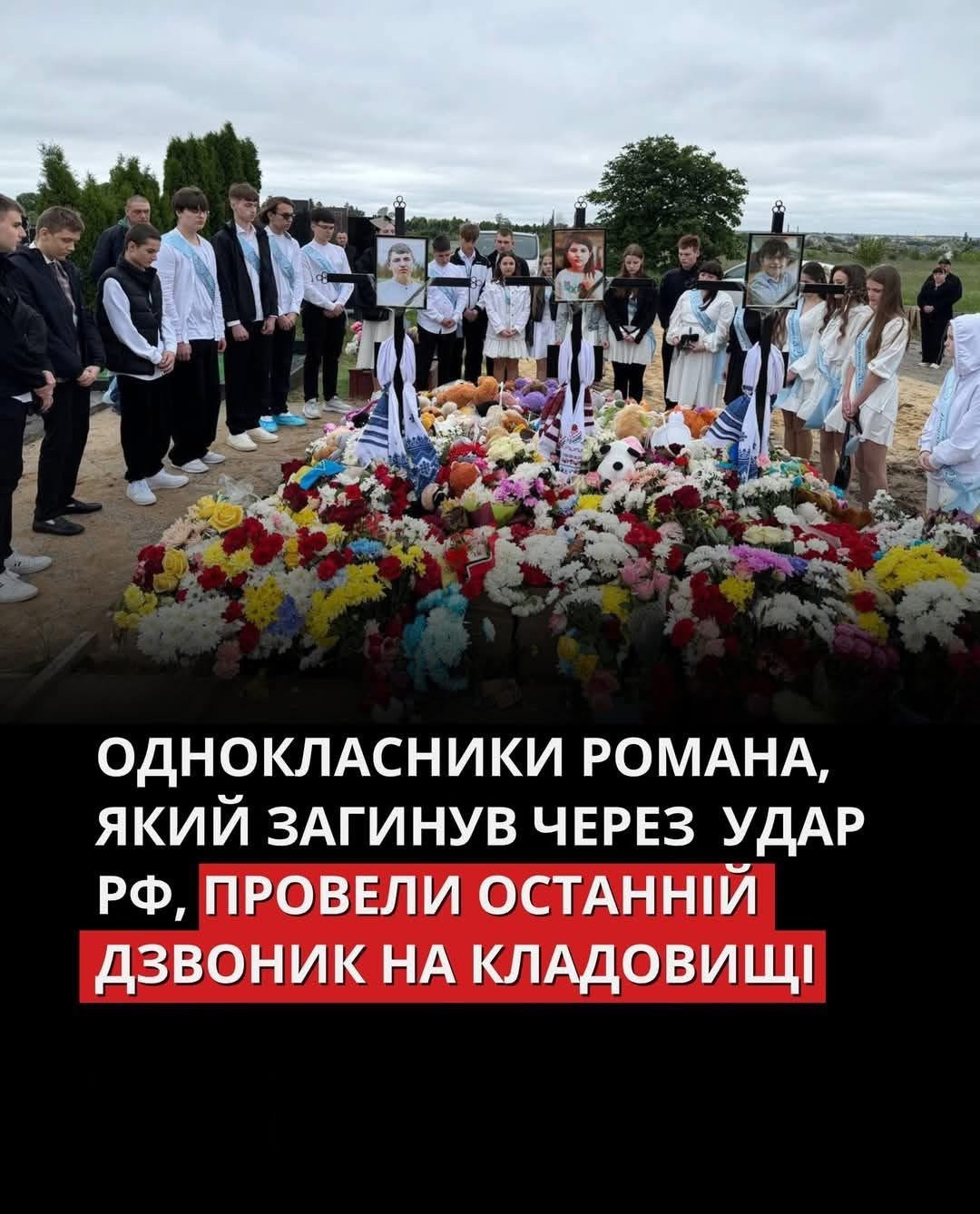Однокласники Романа, який загинув разом з сестрою та братом внаслідок російської атаки по Коростишеву в ніч проти 25 травня, прийшли на кладовище, аби провести останній дзвоник.