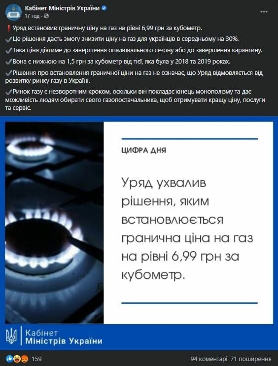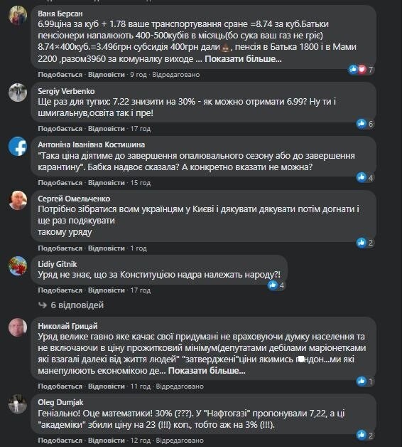 Варто також зазначити той факт, що українці почали активно коментувати публікацію і ділитися своєю думкою щодо таких нововведень: "Тільки в 2018-2019 роках транспортування газу входили в одну платіжку. Так що не дешевше)", " Кабінет міністрів разом з прем'єром і головним метровим невдахою йдуть в ж*пу.", "Лютий і березень, а січень! Олігархи, які сидять на потоках і трубі, випросили не міняти, ось і вам відкат буде. Ось Країна!", "Ще раз для туп*х: 7.22 знизити на 30% - як можна отримати 6.99? Ну ти і шмигальнув, освіта так і пре!".