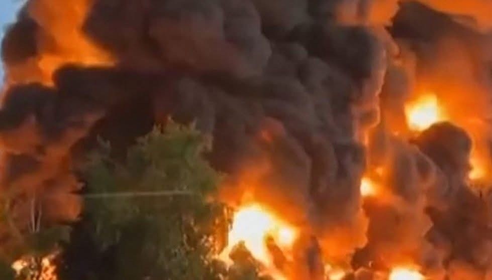 За словами росіян, палає будівля на Новій вулиці підмосковного міста Пушкіно. Усередині нібито легкозаймисті рідини в бочках, газові балони та піддониЗа попередніми даними, площа пожежі становить 8,1 тисячі квадратів