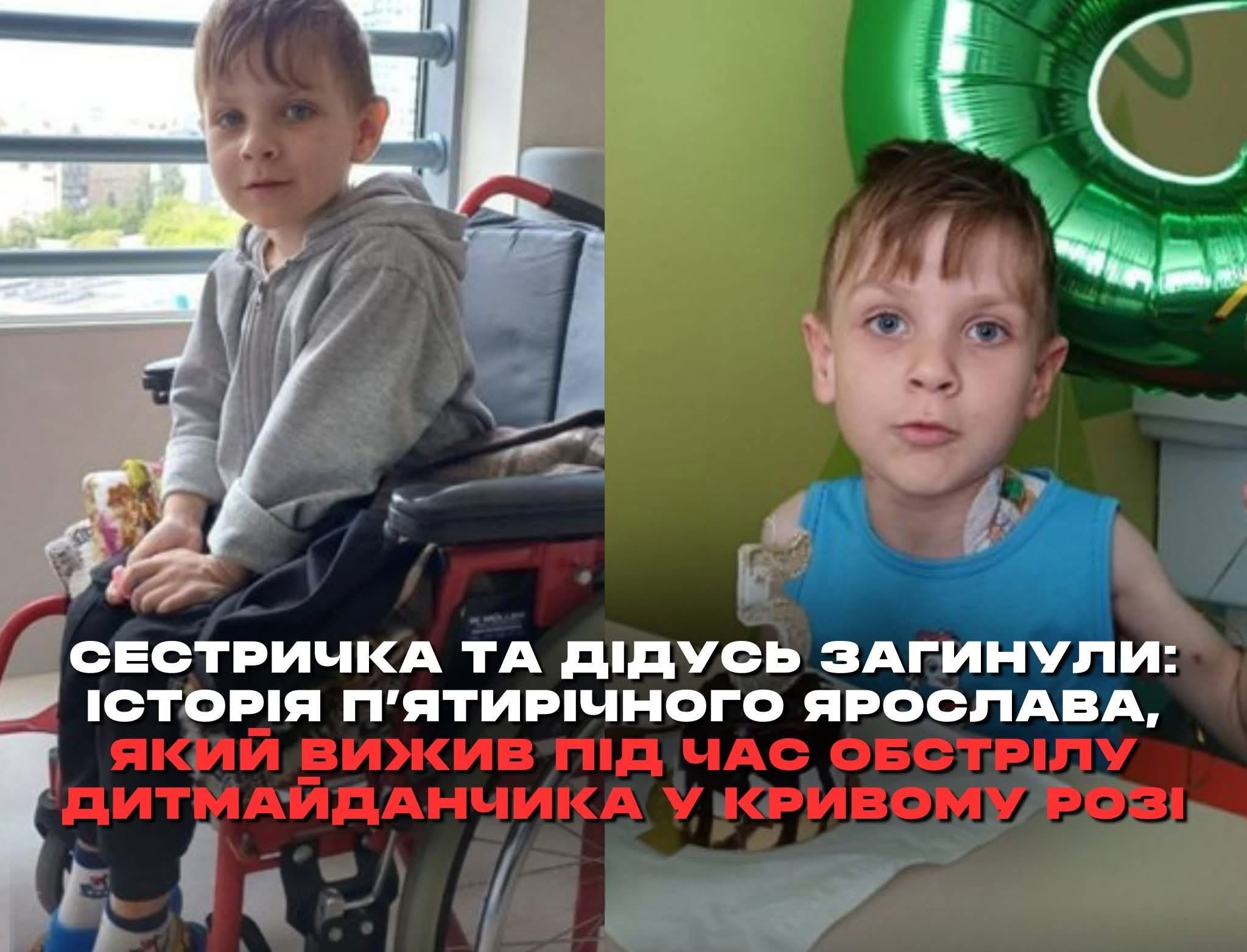 Того дня Ярослав гуляв із дідусем та двоюрідною сестрою, коли армія РФ вдарила по місту. 67-річний дідусь Сергій та 7-річна Аріна загинули на місці. Ярослав вижив дивом — важко пораненого хлопчика до лікарні відвіз випадковий перехожий.