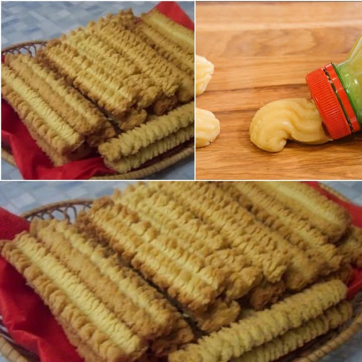 Прокручуємо тісто на ручній м’ясорубці, або через пляшку, але для цього треба в пробці зробити виріз, який і буде формувати печиво, далі викладаючи на лист, застелений пергаментом.