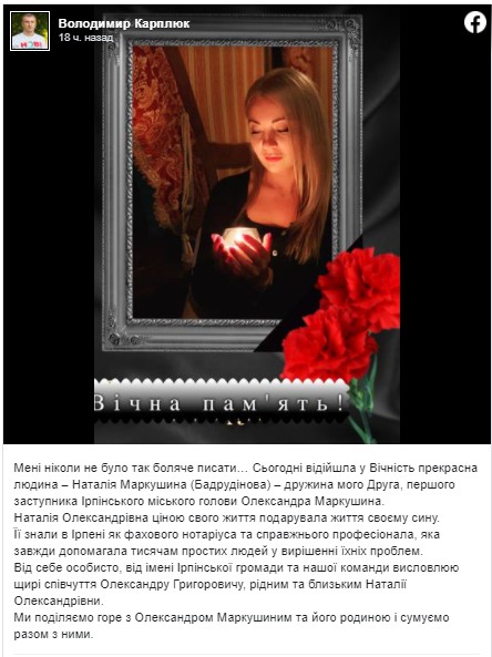 Колега Ірпінського міського голови у Facebook висловив співчуття Маркушину. Жінку він згадує, як фахового нотаріуса та справжнього професіонала, яка завжди допомагала людям.