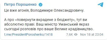 Порошенко → Зеленському: “Це вже агонія, Володимире Олександровичу. А про “повернути вкрадене з бюджету”, тут ви абсолютно праві.”