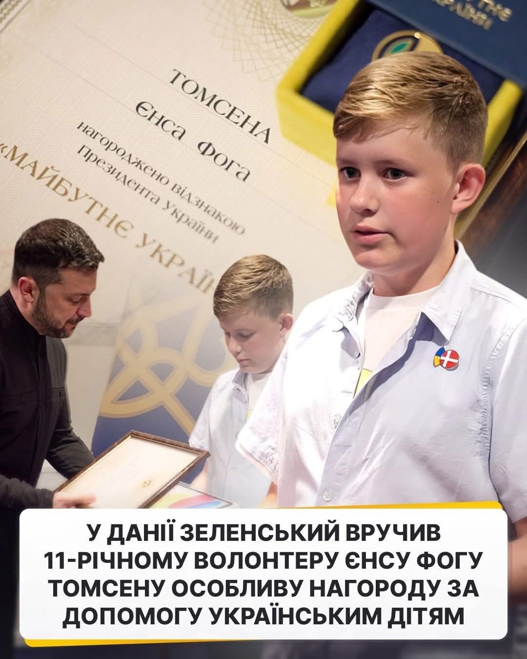 🇺🇦🇩🇰 Президент України вручив відзнаку "Майбутнє України" данському школяреві. Єнс почав допомагати Україні торік, коли побачив новини про українських дітей, які втратили дім через агресію РФ.