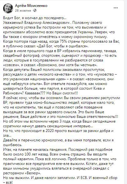 У Мережі українець Артем Моїсеїнко на своїй сторінці у Фейсбук опублікував важливе звернення до президента Володимира Зеленського. Чоловік згадав усі провали президента і його команди, проте все ж відзначив, що у Зеленського ще є шанс виправити ситуацію і увійти в історію.