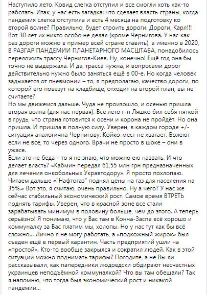 Але ми рухаємося далі. Дива не сталося, і восени прийшла друга хвиля (для нас перша). Все літо пан Ляшко бив себе п’ятою в груди, що країна готується до осені і корона не пройде. Але вона прийшла. І прийшла в повну силу. Упевнений, в кожному місті +/- ситуація аналогічна Чернігову. Ліжко-місць не вистачає. Хворіють якщо не всі, то через одного. Лікарі не просто в шоці – вони нажахані.