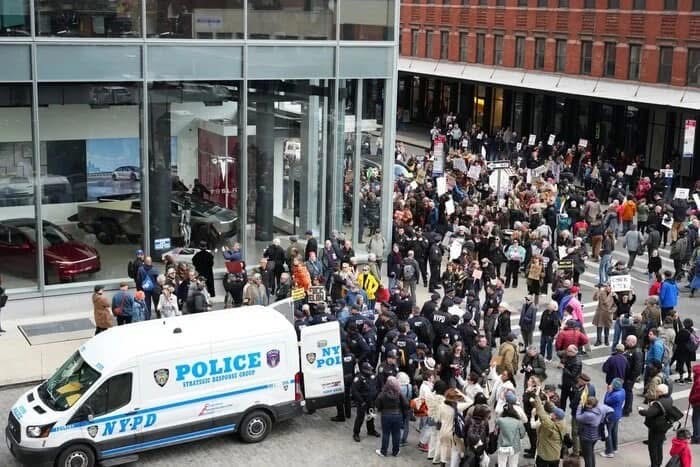 Протестуючі зібрались у виставкових залах Tesla у Нью-Йорку, Бостоні, Сан-Франциско і Тусон, вигукуючи гасла та тримаючи плакати. За даними Associated Press, у Нью-Йорку на протест прийшло близько 300 осіб, з яких 9 – арештували.