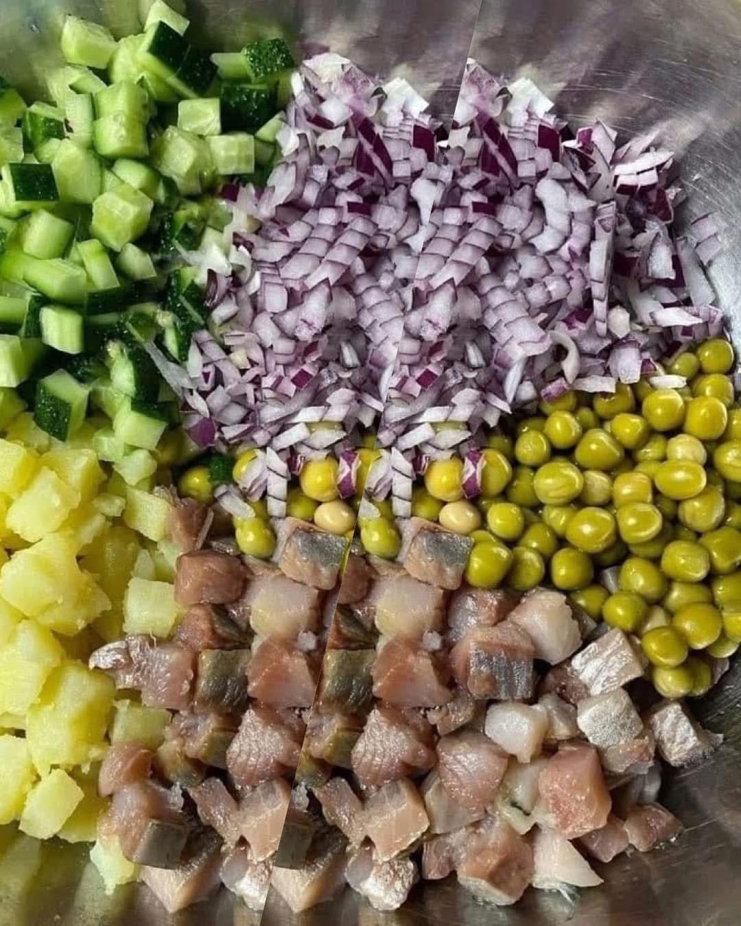 1. Наріжте кубиками оселедець, картоплю та огірок.
