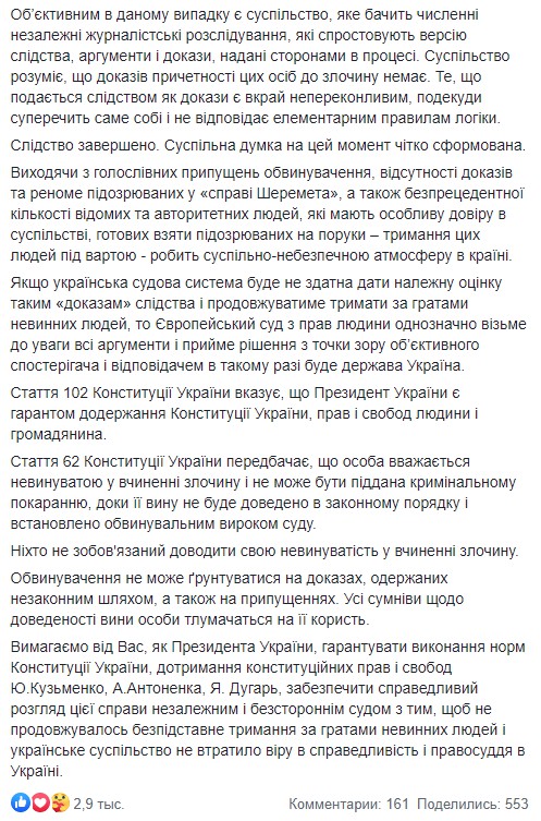 За словами Сенцова, справа Шеремета зараз не має справедливого розслідування, а волонтери несуть покарання і зараз під арештом замість справжніх злочинців. Тому Сенцов вимагає від президента України дотримання своїх обов’язків.